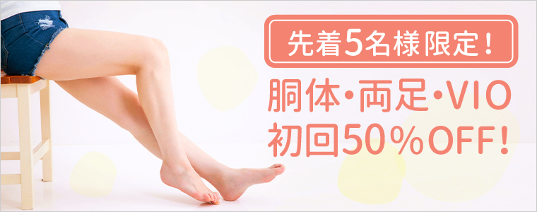 先着5名様限定で、胴体(脇込み)・両足(お尻除く)・VIOの脱毛初回料金がなんと50%OFF!